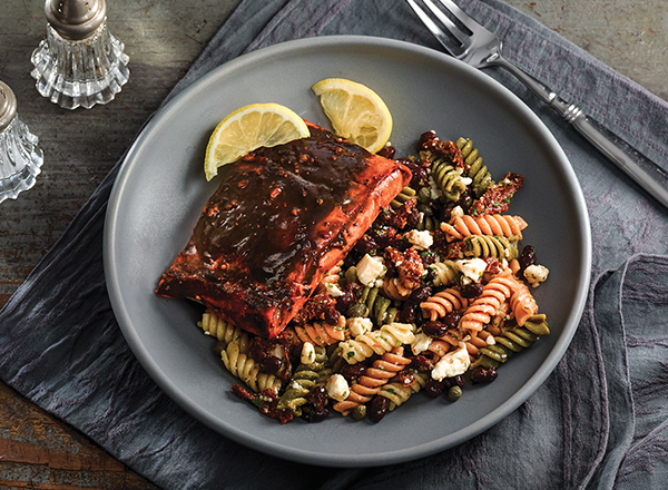 Sweet & Sour Salmon with Black Bean & Pasta Salad this meal looks really delicious and considering my own husband loves salmon and pasta salad I think he would enjoy this dish. If you're no carb low carb skip the black beans and pasta salad and have a nice salad with fresh blueberries and strawberries in it!